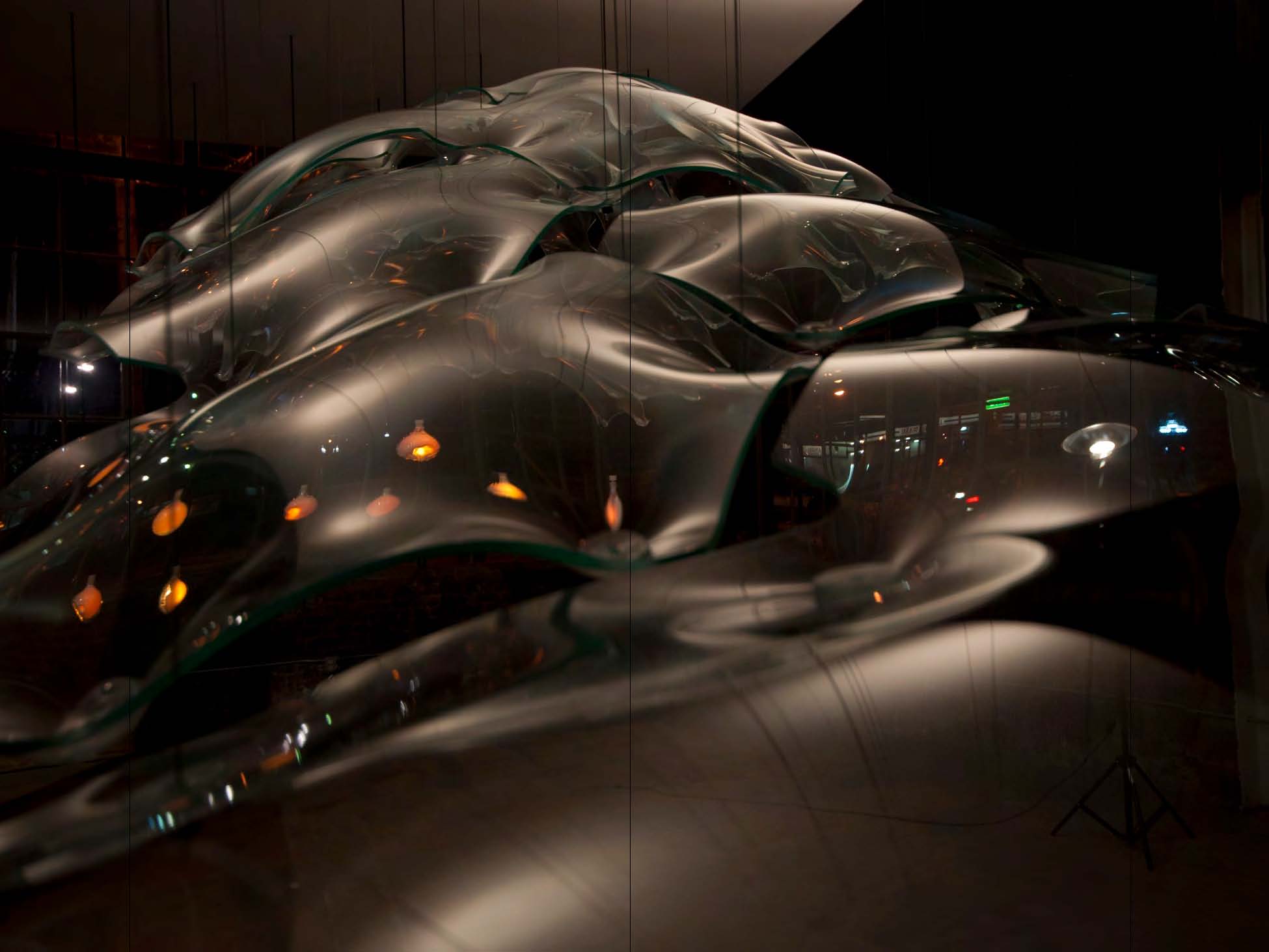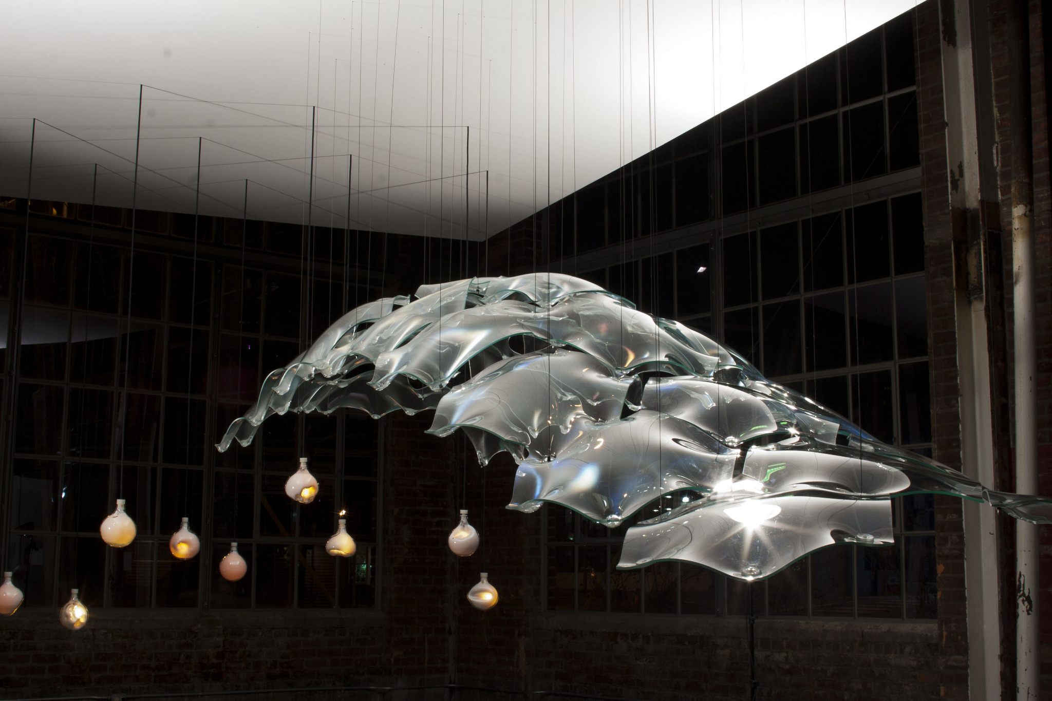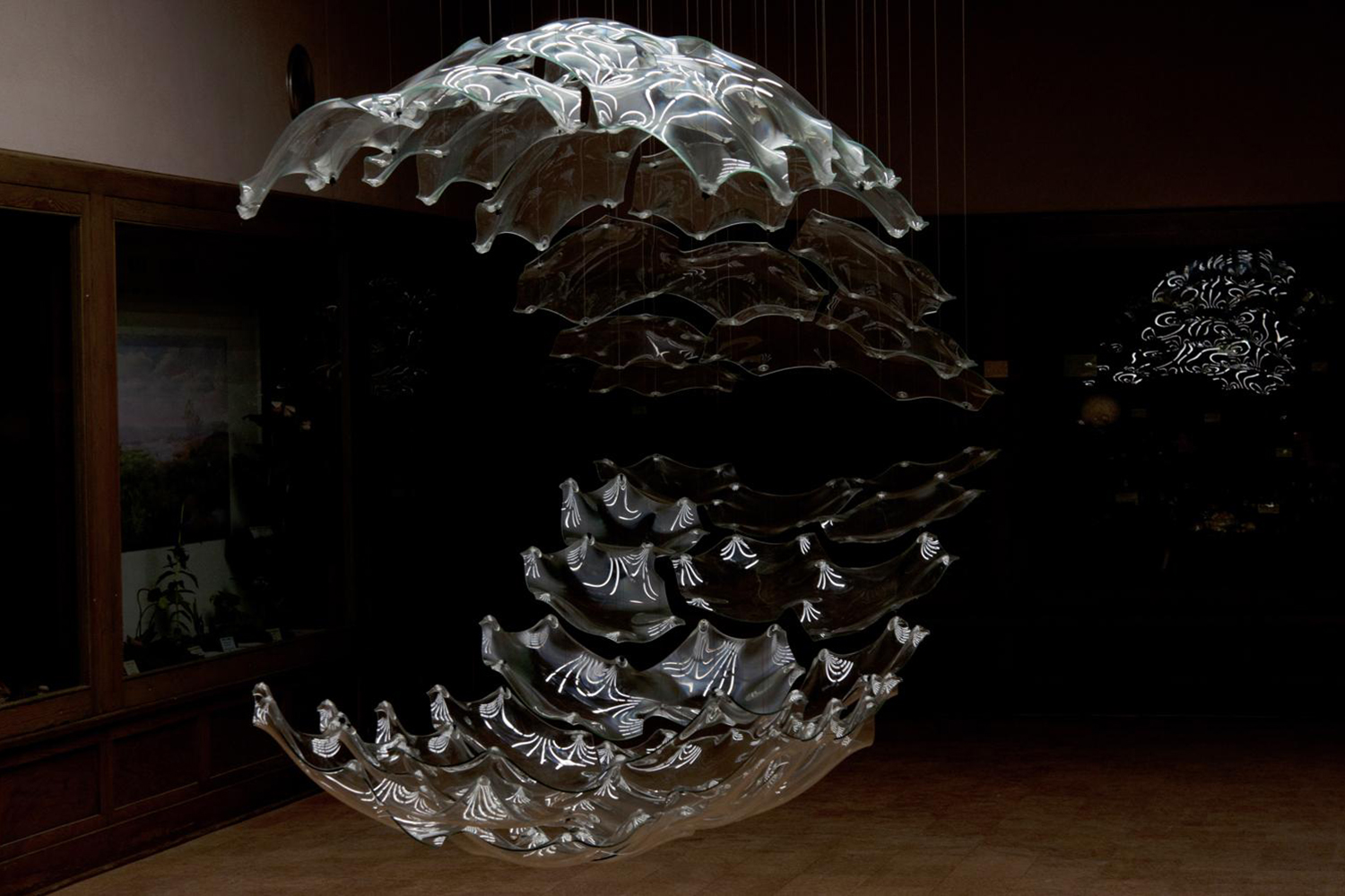 Made of glass, the work is constructed through a process of free form catenary slumping. Each piece of the work is subjected to its own temperature and duration setting providing variation in curvature and detail throughout the entire project.