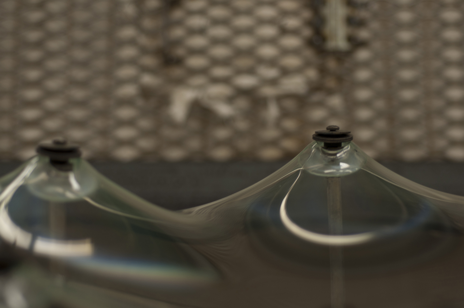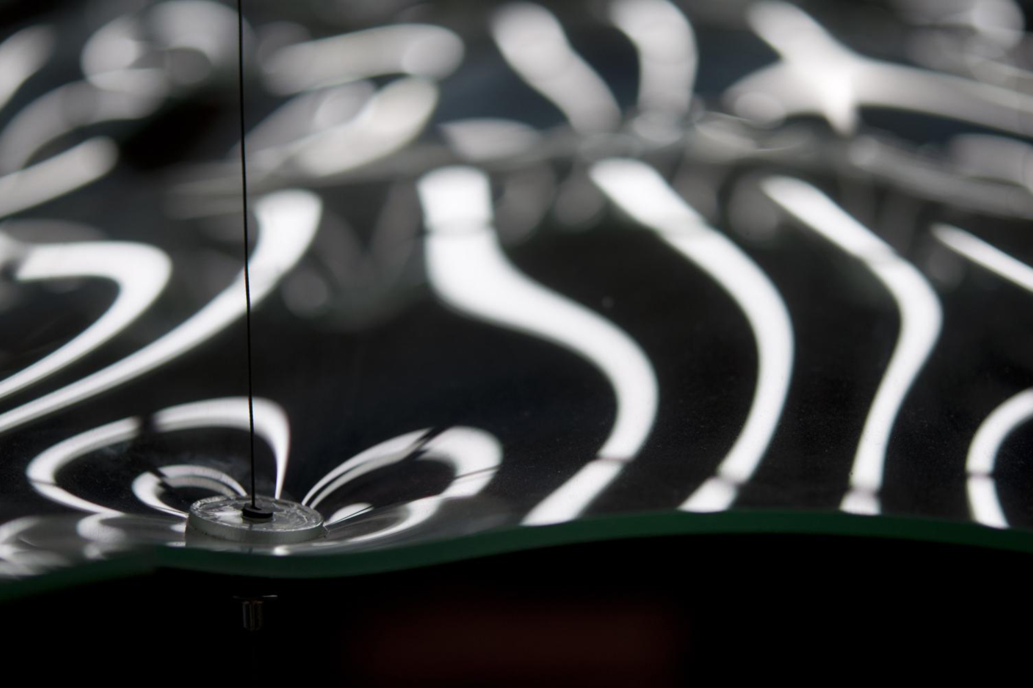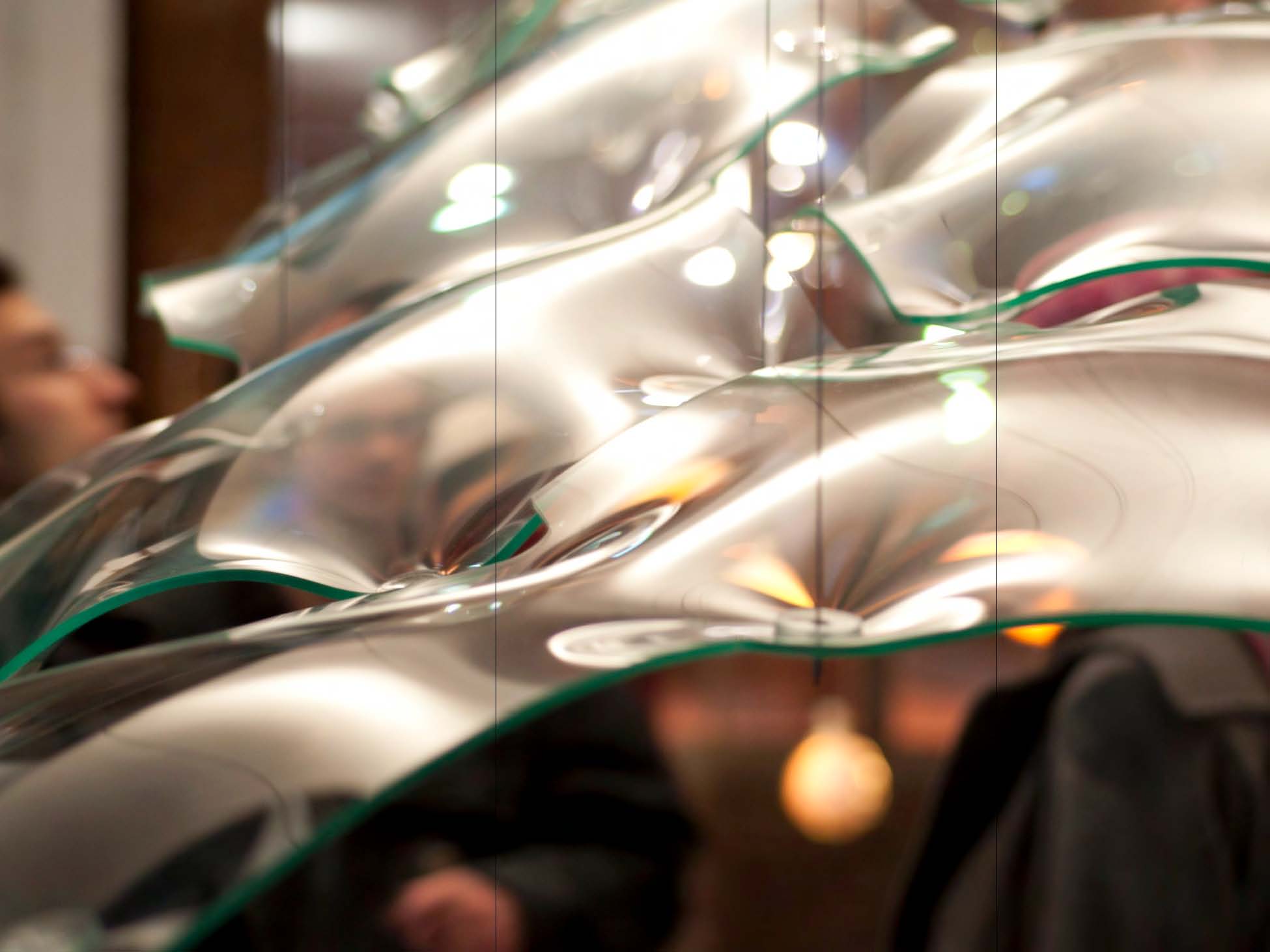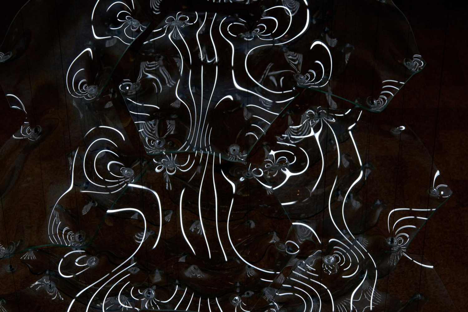 Made of glass, the work is constructed through a process of free form catenary slumping. Each piece of the work is subjected to its own temperature and duration setting providing variation in curvature and detail throughout the entire project.