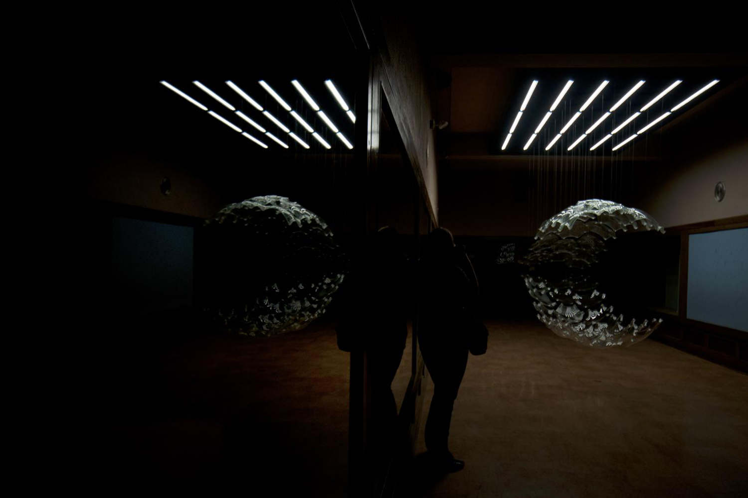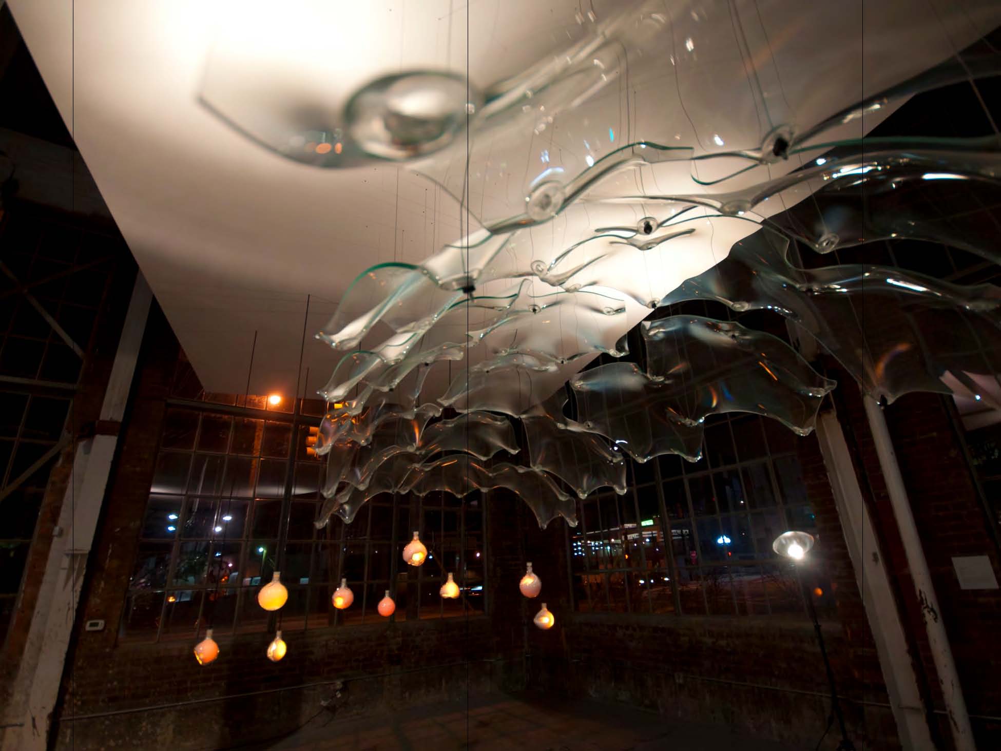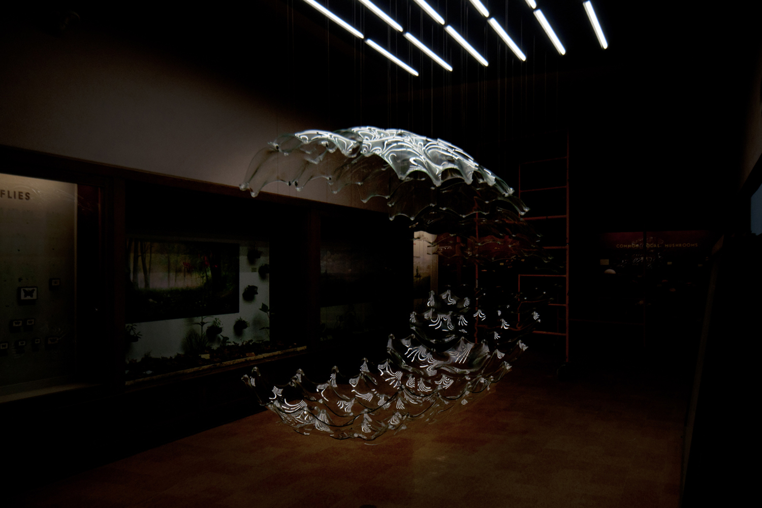 Suspended in air, curious in its natural form and artificial in its existence, Specimen evokes a peculiar creature of irregular origins. Made of glass, the work is constructed through a process of free form catenary slumping. Each piece of the work is subjected to its own temperature and duration setting providing variation in curvature and detail throughout the entire project. Lit from above the curvatures of each piece reflect the simple custom fluorescent light embedded ceiling suspended overhead. The resultant is a kaleidoscope-like effect of its surrounds, daring light to move around the space in two layers of different grains of reflection. The work is placed in the old Nature’s Medley Hall of the old Public Museum surrounded by encased specimens of insects and plants. The glass cases of the abandoned specimens reflect the work as a whole multiplying the presence of Specimen within the space. Hovering, the visitor can walk around the work.
