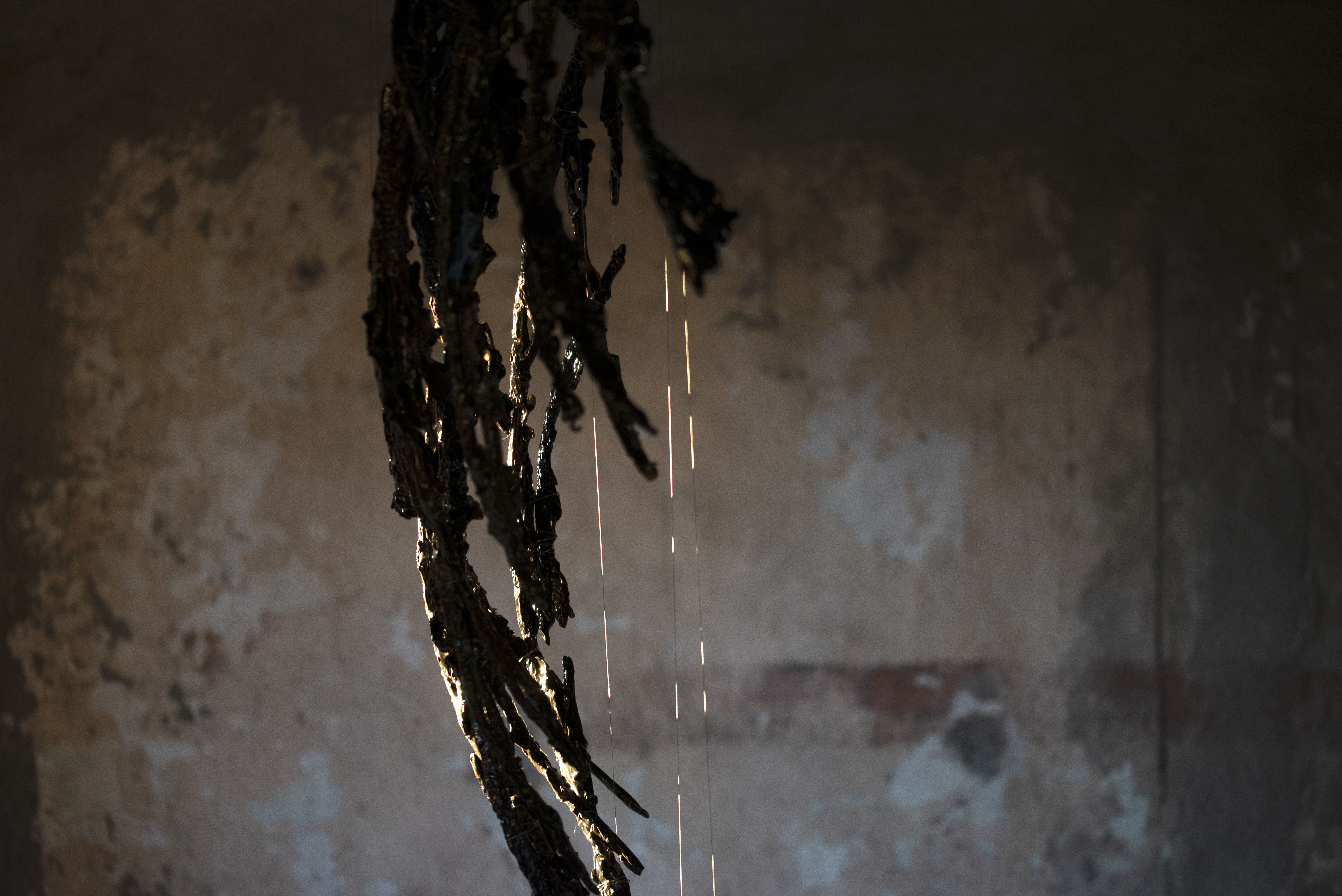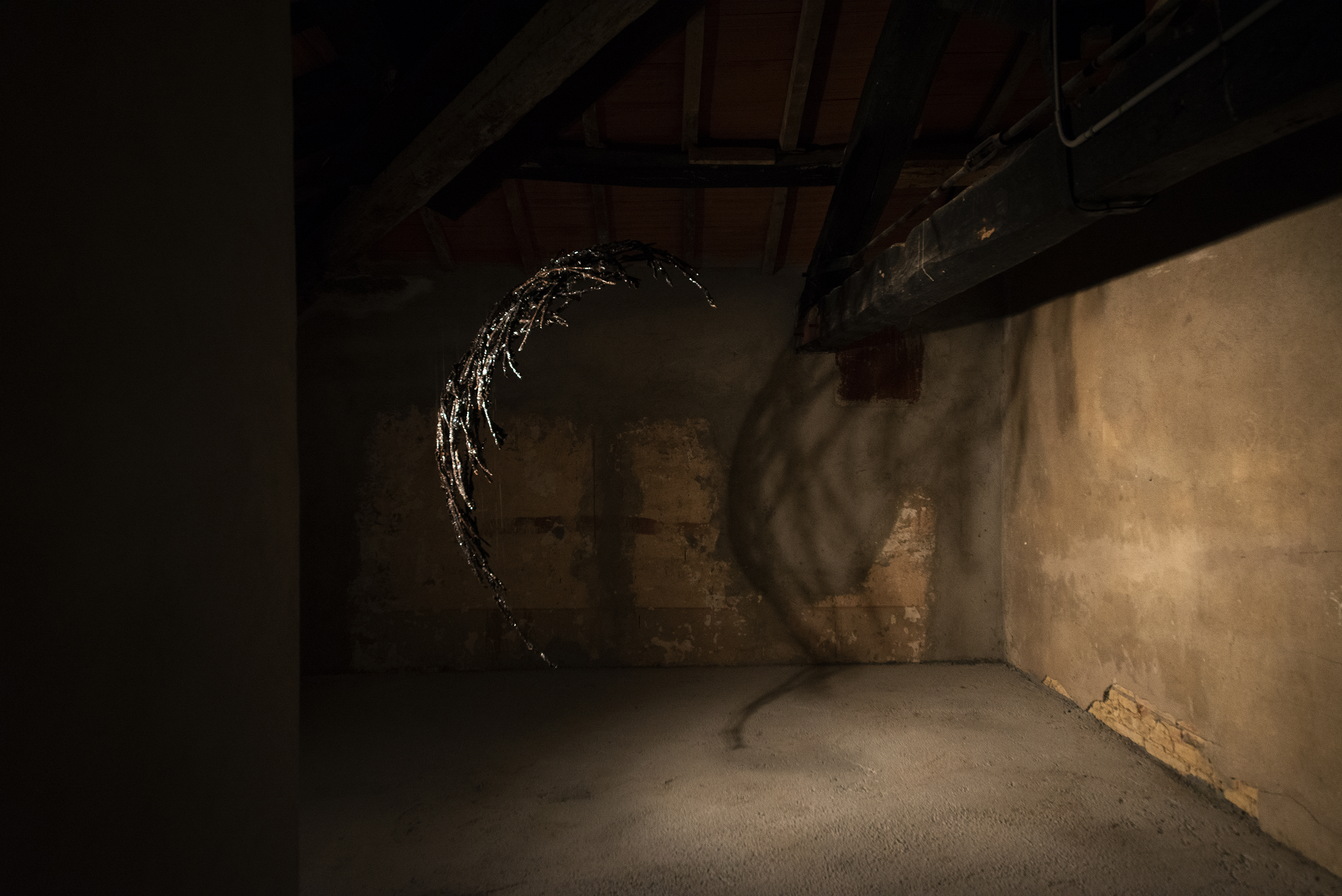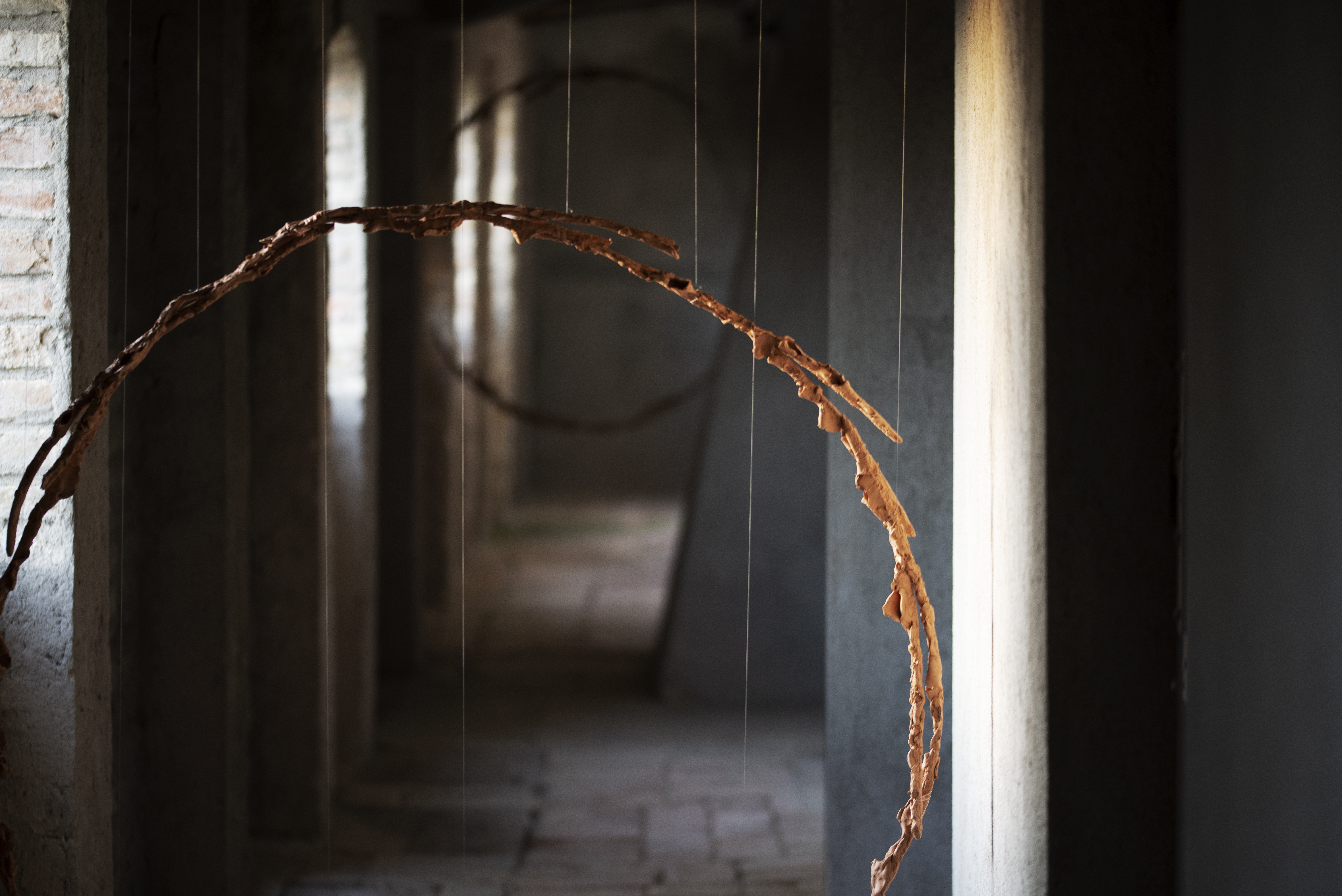 Lune: Borrowed Light is a series of moons hidden within a castle in Italy. Made from local clay, the works are pulled from the land and suspended out of place, allowing the architecture of the castle to host these ghostly celestial forms. Dark rich glazes cover the pieces, catching and borrowing the light from the greater surroundings as sky shifts across day and night. These moons were placed in intimate enclosures, briefly bringing close a planetary acquaintance often dreamed about from afar. And in the darkness of night, Lune vanishes when all the light is gone.