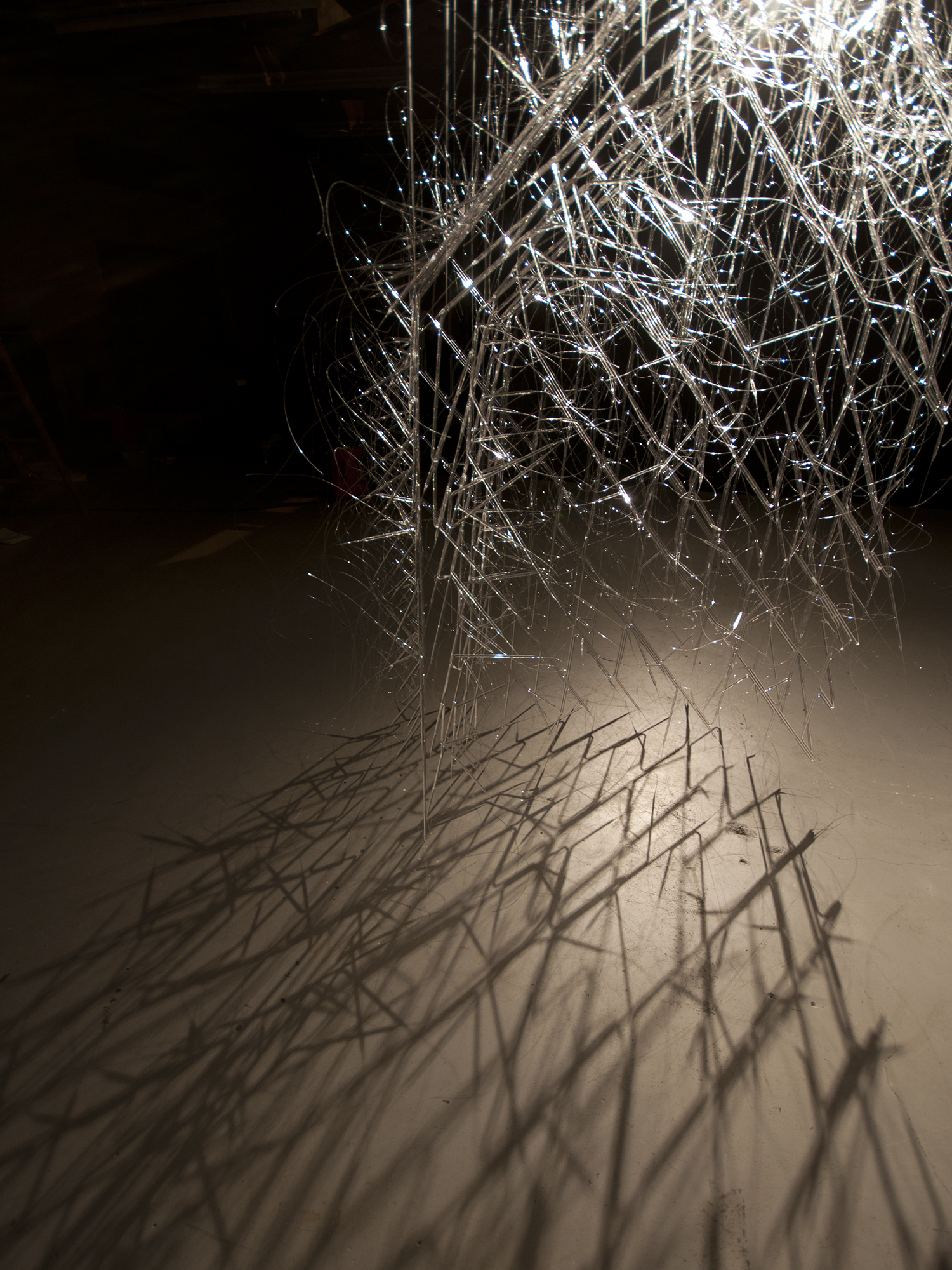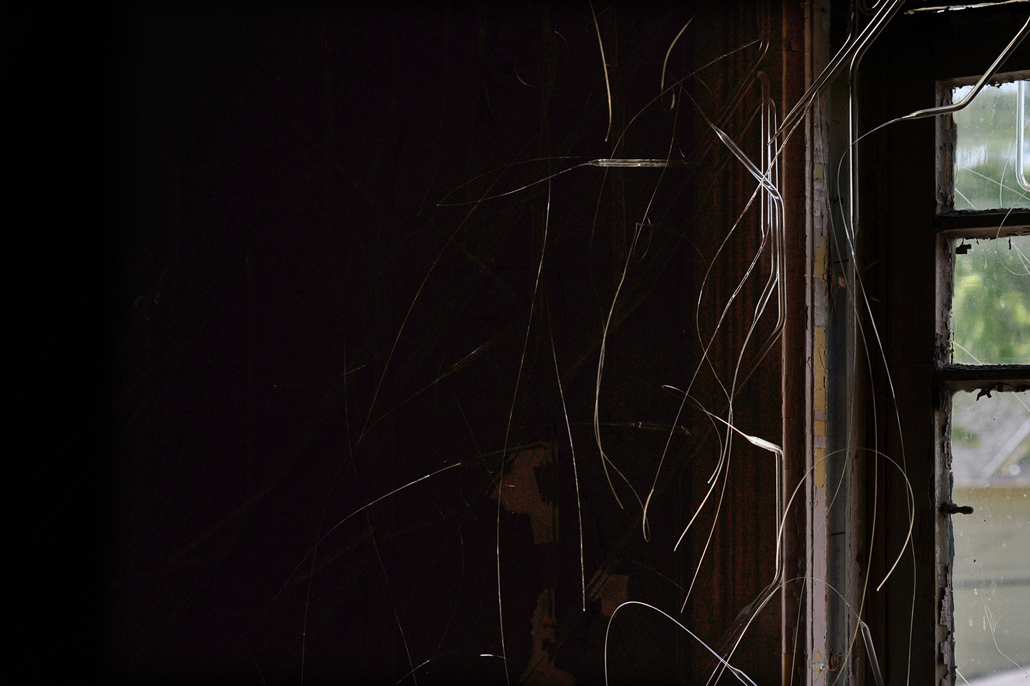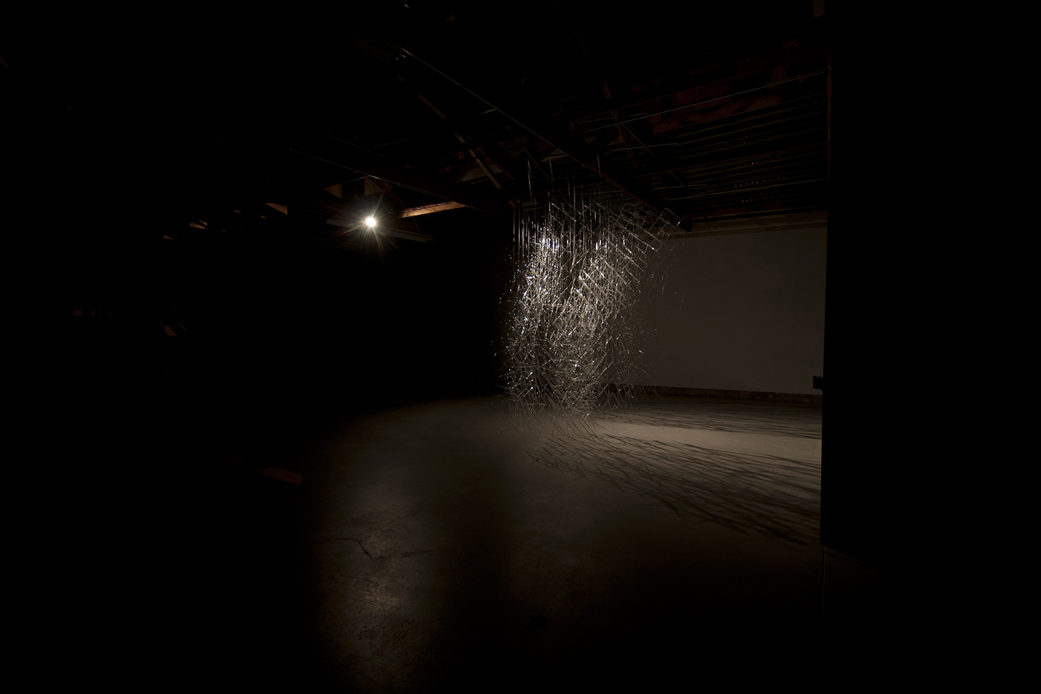 Amplifying, transporting, and distorting the volumes surrounding and within a contested existing domestic environment, Second Story reconfigures spaces that were once familiar into an “other” occupation and visual register. Used to imprint the space and excite the atmosphere, this inhabitable texture is driven by the manipulation of factory standard acrylic rods to capture, manipulate, and distort the existing volumes of the second story of Spencer’s Funeral home in Flint, Michigan, a house slated for demolition. Inherently transparent, the material both captures and permits the passing of light, visually distorting its presence and the view beyond, through refraction and reflection, altering both the context, the perception of its physical boundaries, and heightening the role of the building in the neighborhood. The work agitates, relocates, and makes accessible new volumes otherwise once unoccupiable: the exterior zone, the wall depth, and the depth of a windowsill. As a further technique of distortion and interplay of tectonic connection and assembly, the acrylic rods are systematically manipulated through the use of heat. One such technique allows for the bending and forming of components to create a pattern that resonates with its context, but also distorts the a priori relationships within the house to construct depth and volume originally unused or nonexistent. A further alteration is the tapering and pulling of the material, developing extensions and strands that flee in a near weightless in pursuit of space, altering the perception and depth they occupy. The otherness of Second Story is further heightened by suspending the piece above the ground by tethering it to the building’s roof trusses so that it hovers to promote a ephemeral sense of space, an attuned acknowledgement of its surrounding, and an implied stretched atmosphere.