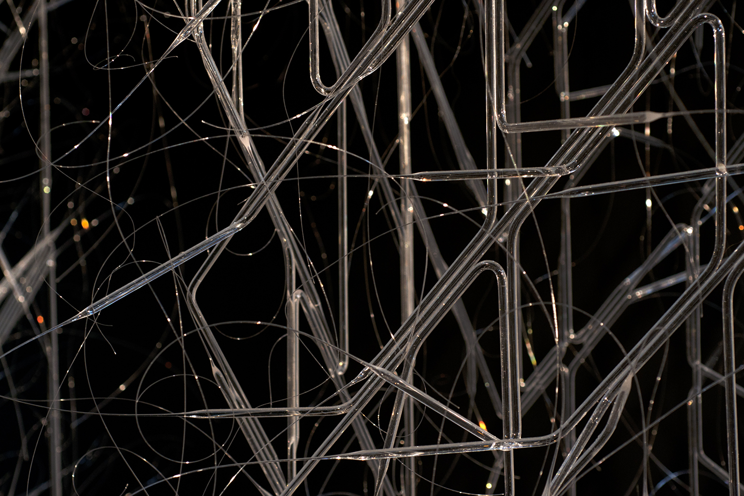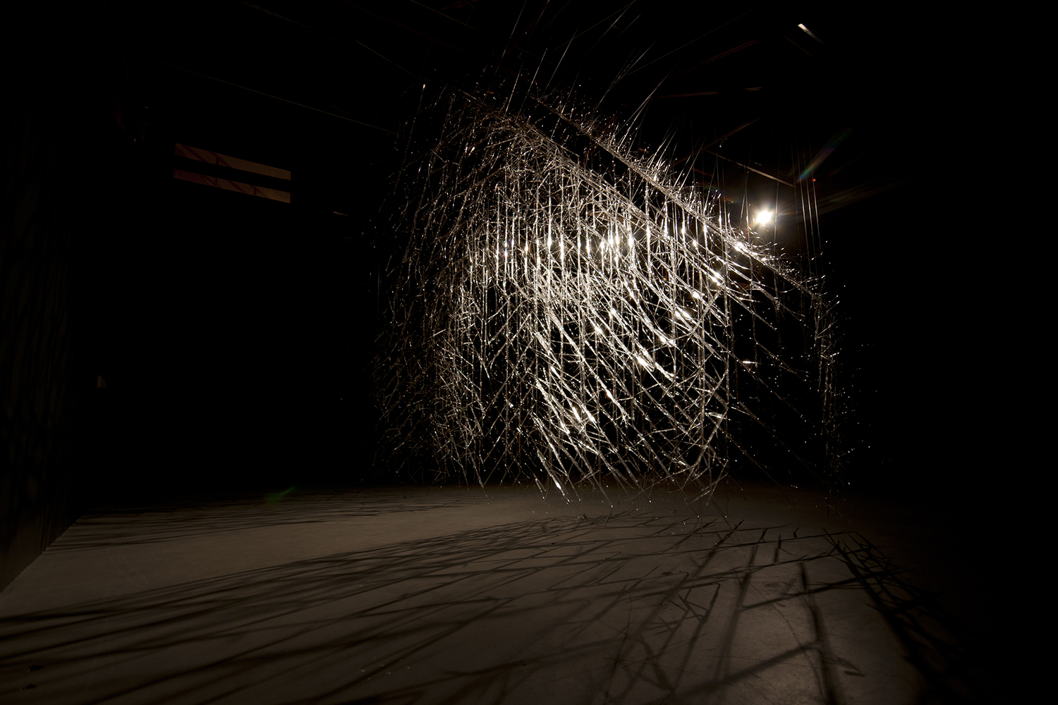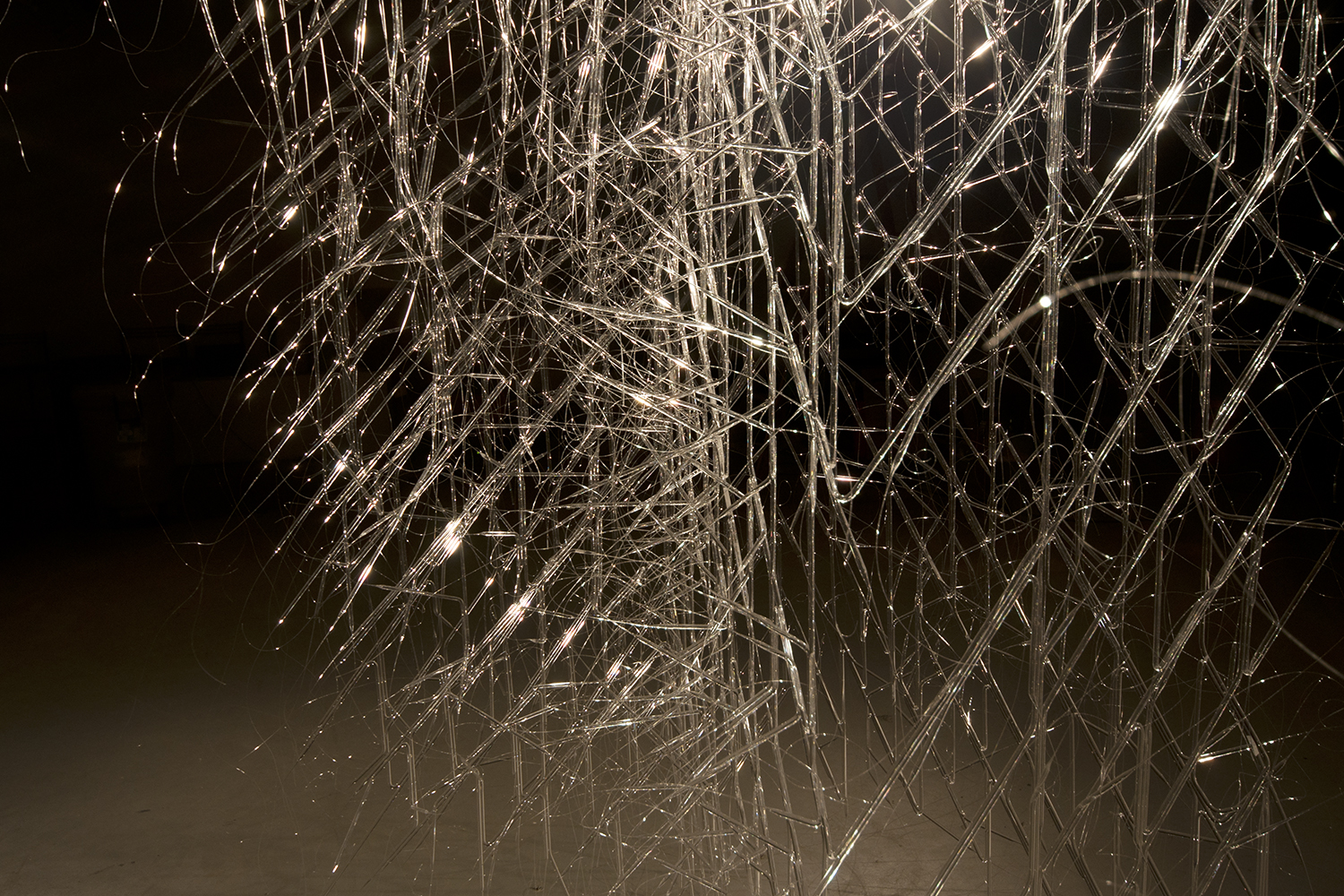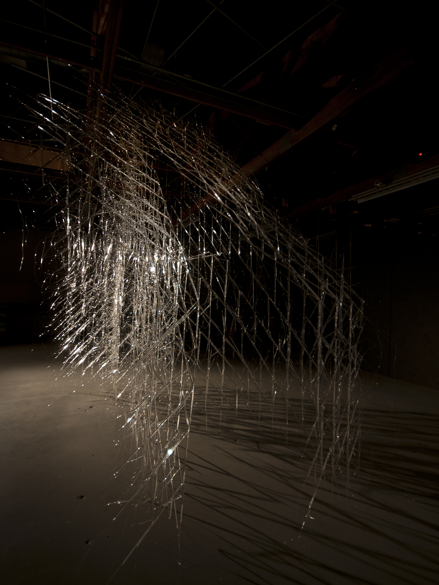 Amplifying, transporting, and distorting the volumes surrounding and within a contested existing domestic environment, Second Story reconfigures spaces that were once familiar into an “other” occupation and visual register. Used to imprint the space and excite the atmosphere, this inhabitable texture is driven by the manipulation of factory standard acrylic rods to capture, manipulate, and distort the existing volumes of the second story of Spencer’s Funeral home in Flint, Michigan, a house slated for demolition. Inherently transparent, the material both captures and permits the passing of light, visually distorting its presence and the view beyond, through refraction and reflection, altering both the context, the perception of its physical boundaries, and heightening the role of the building in the neighborhood. The work agitates, relocates, and makes accessible new volumes otherwise once unoccupiable: the exterior zone, the wall depth, and the depth of a windowsill. As a further technique of distortion and interplay of tectonic connection and assembly, the acrylic rods are systematically manipulated through the use of heat. One such technique allows for the bending and forming of components to create a pattern that resonates with its context, but also distorts the a priori relationships within the house to construct depth and volume originally unused or nonexistent. A further alteration is the tapering and pulling of the material, developing extensions and strands that flee in a near weightless in pursuit of space, altering the perception and depth they occupy. The otherness of Second Story is further heightened by suspending the piece above the ground by tethering it to the building’s roof trusses so that it hovers to promote a ephemeral sense of space, an attuned acknowledgement of its surrounding, and an implied stretched atmosphere.