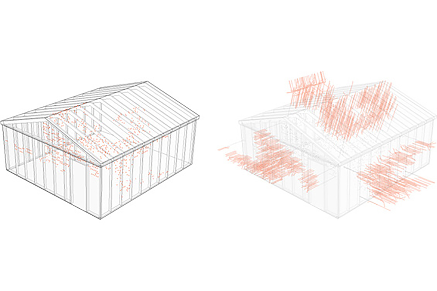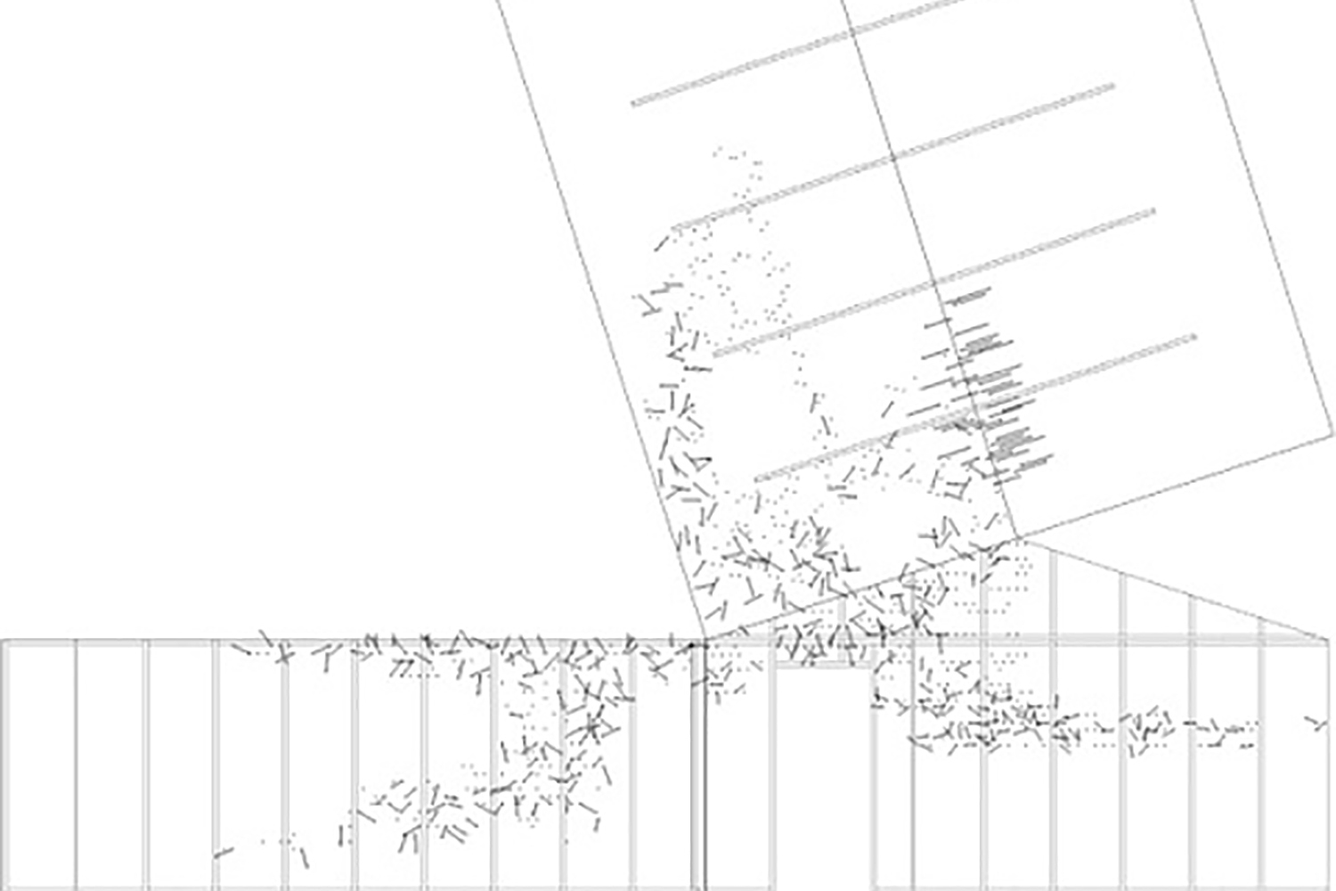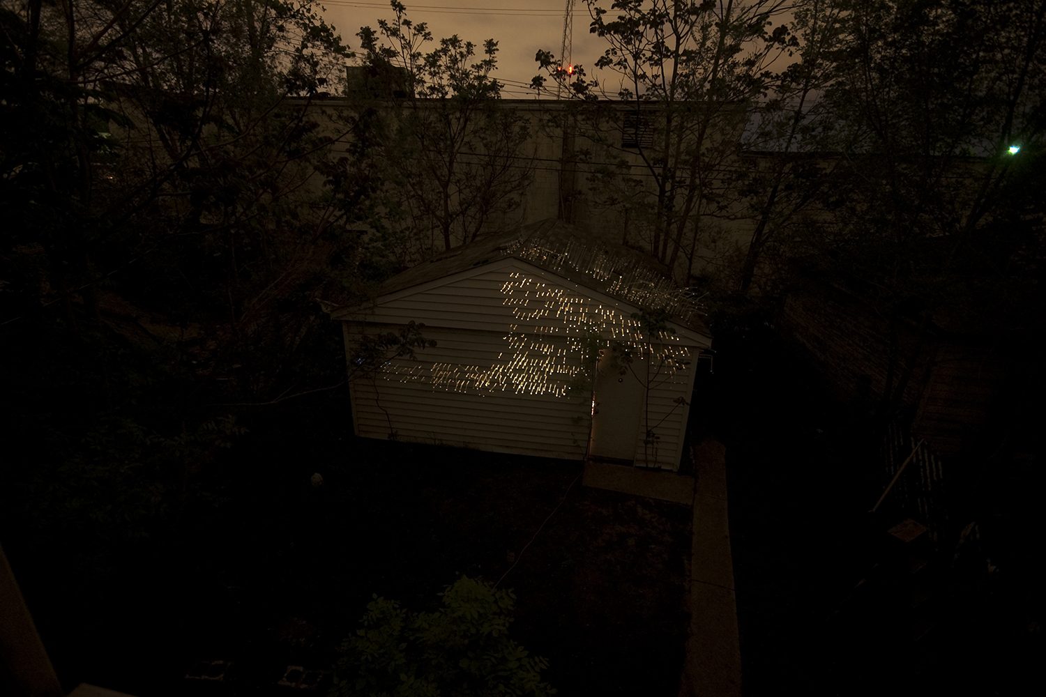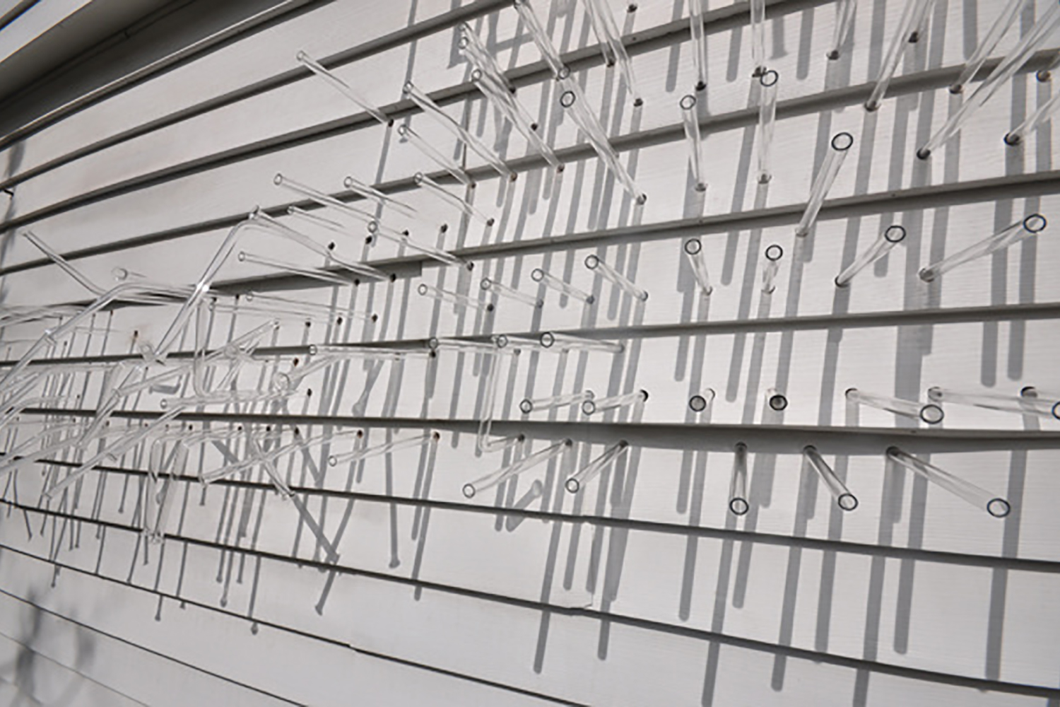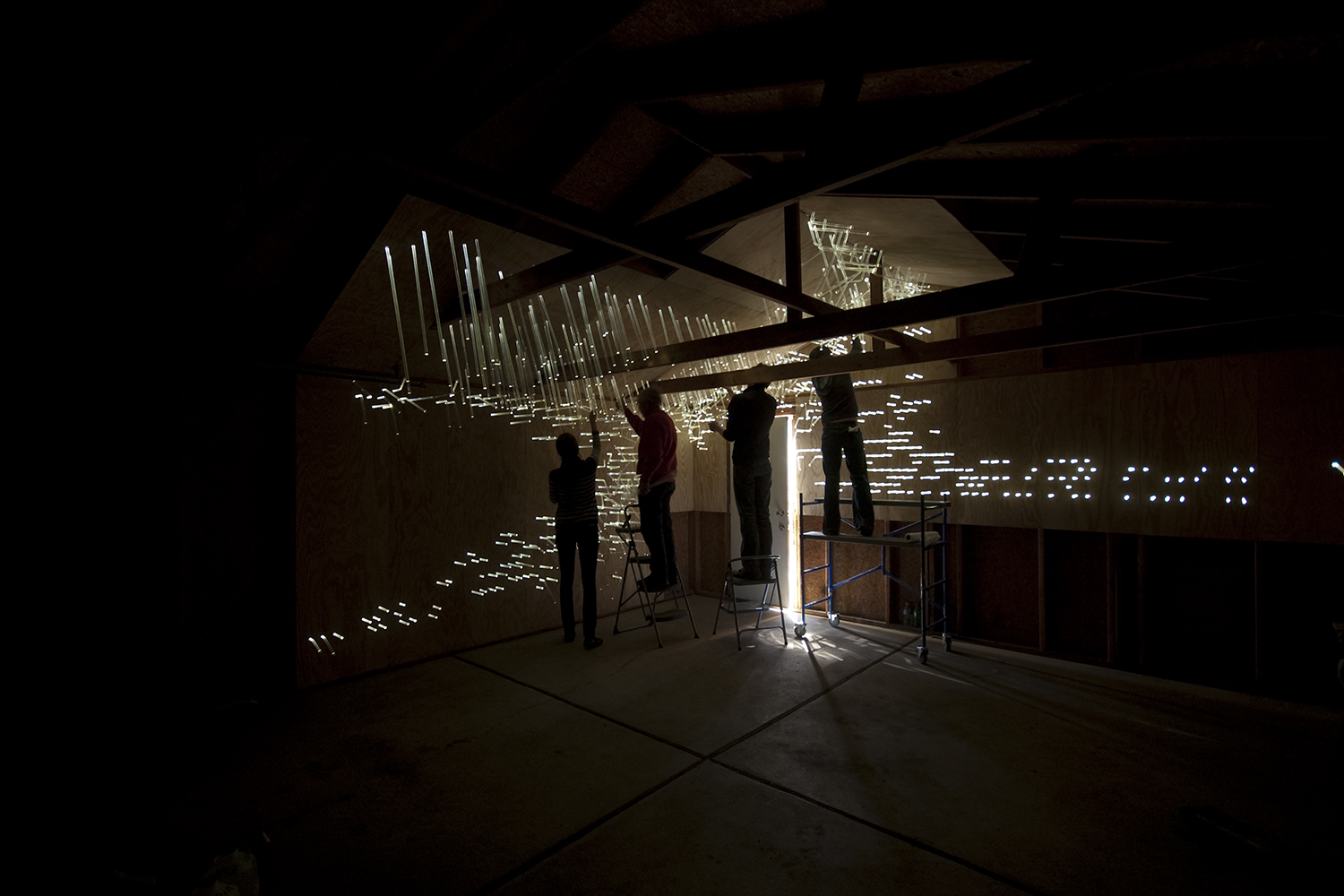 As a material study and electrical experimentation, this alteration to a stand-alone garage mutates and activates the barrier between the atmospheres of the interior, and the greater surroundings on the exterior. As a replacement of the common flat-pane windows, Weatherizing utilizes the typical mediator of glass in an unusual configuration allowing for an altered understanding of volume and exchange. Comprised of nearly one thousand glass tubes, the work spatializes and amplifies light conditions, both natural and artificial, and the flow of air. Varying in length and bends, the aggregation of the glass tubes works as a material substrate upon which energy is captured in the form of a glow, and an accumulation of hollow channels conduits for energy, air, and precipitation. Mysterious and moody, reliant on the immediate qualities of the atmospheres, the luminosity becomes an eerie registration of the seemingly intangible surrounds and a foil to the once apathetic barrier.